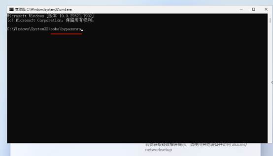 1. 在“让我们为你连接的网络”这一步,按键盘【Shift】+【F10】或者【FN】+【Shift】+【F10】会弹出命令提示符,输入命令oobe\ypassnro(如图二,鼠标在输入命令的地方点一下然后输入命令。),再按【Enter】键,系统将会重新启动。
